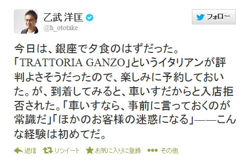 @h_ototake今日は、銀座で夕食のはずだった。「TRATTORIA GANZO」というイタリアンが評判よさそうだったので、楽しみに予約しておいた。 が、到着してみると、車いすだからと入店拒否された。「車いすなら、事前に言っておくのが常識だ」「ほかのお客様の迷惑になる」――こんな経験は初めてだ。
